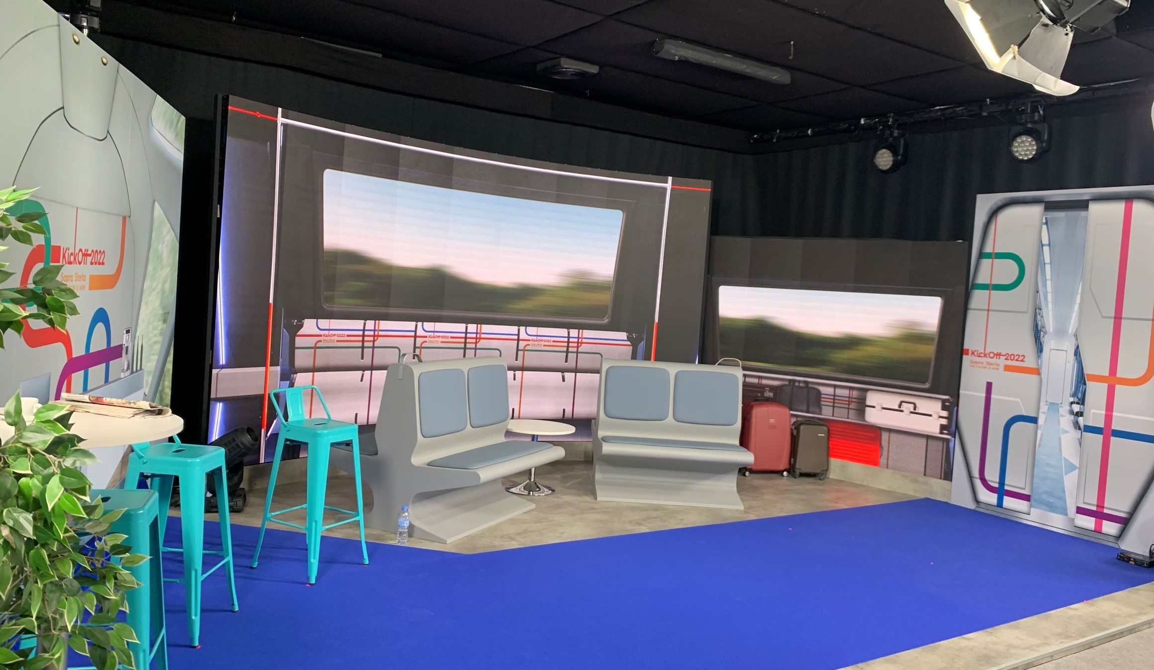 En Locale Live Centre se puede desarrollar contenido audiovisual para eventos con recursos tecnológicos como la realidad aumentada, soluciones holográficas, gráficos 3D, gamificación etc. A nivel escenográfico se puede, por ejemplo, modificar la estética y color del suelo para combinarlo con el mobiliario, replicar los colores corporativos del cliente o conseguir un efecto más llamativo. El look que se le puede dar al plató, gracias a las opciones de mobiliario, lo puede convertir en un late-night televisivo, darle formato mesa redonda, transformarlo en un acogedor hogar o como en este caso con Sopra Steria, transformarlo en un vagón de tren. Las estructuras son también adaptables y pueden incorporar una tercera pantalla LED o distintas gráficas personalizadas.