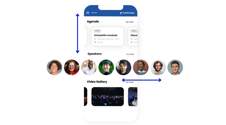 Al abrir la app verías una pantalla navegable con una serie de apartados con contenidos seleccionados para tí en función de los criterios que haya decidido el organizador, además tendrías de forma accesible y visual lo más destacado del evento. También dispondrías de unos botones de acceso directo a funcionalidades relevantes para el evento, como el lead scanner o la agenda.