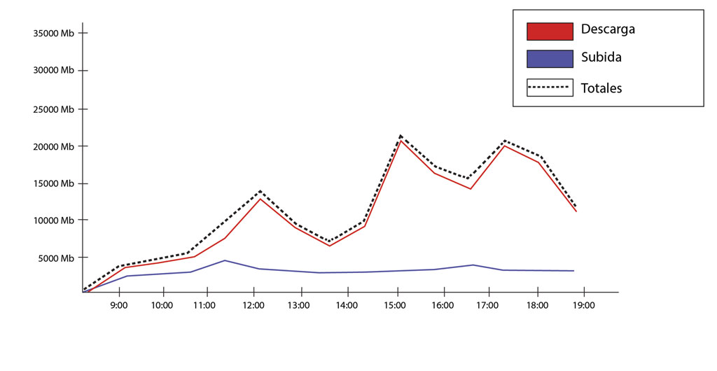 Durante el evento se conectaron a la red 226 dispositivos (móviles, tablets y ordenadores) y se consumió más de 78 GB de consumo. Primaron las páginas de tipo social networking y news a lo largo del día.