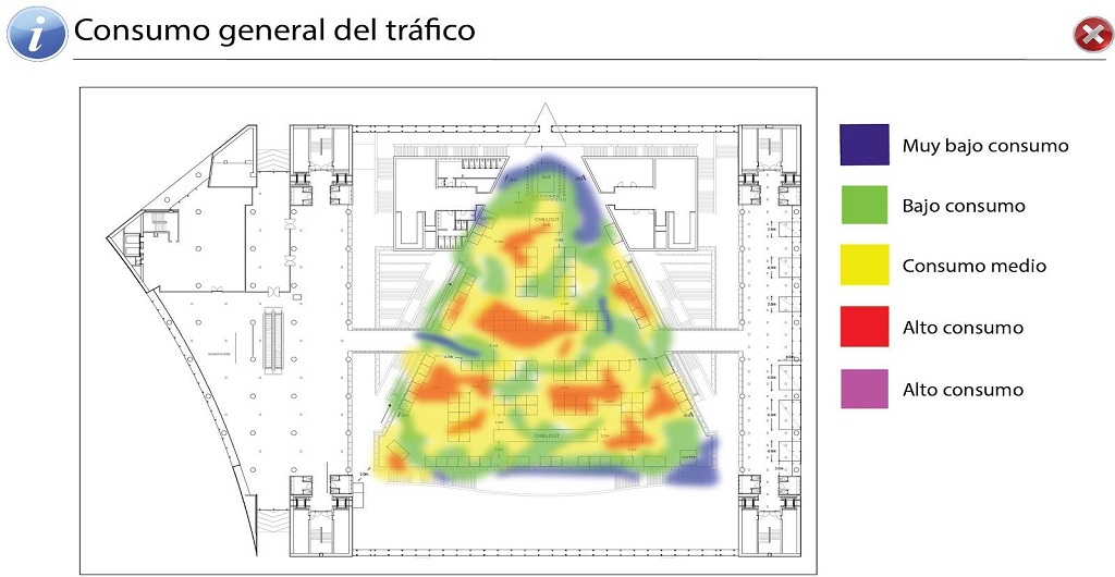 El consumo general del tráfico permite obtener la demanda total del ancho de banda que se ha consumido durante el evento. Puede ser representada de dos formas, en mapa de calor, mostrando las áreas de mayor consumo, o en formato gráfica que muestra los megas consumidos y actualizados cada hora.