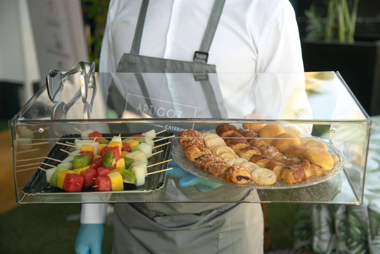 Lo que especifica  el protocolo para servicios de restauración del ICTE es, en primer lugar, que el servicio de catering debe prestarse en condiciones de seguridad. Esto significa:” evitar la presentación a granel de los productos o cualquier forma de disposición que no evite el contacto entre participantes.”  Como regla general recomienda puntos de entrega descentralizados para evitar una excesiva concentración de personas y  la utilización de alimentos en formato individual: porciones individuales tipo pack-lunch, productos estuchados/empaquetados, cafés servidos en vasos desechables cerrados y buffet asistido por personal. Por ejemplo: en nuestro evento Hello again! Artigot sirvió al comensal desde tableros protegidos con mamparas de metacrilato.
