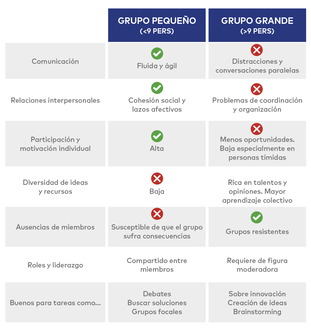 Las investigaciones sobre el tamaño de los equipos, aunque no ofrecen resultados determinantes, sí permiten un entendimiento aproximado útil. Algunas indican que el número ideal estaría entre 5 y 12, en general las empresas creen que el número perfecto es 6… En definitiva la mayoría de los expertos en el tema coinciden en que el número óptimo para formar un grupo sin líder es de 7 +/- 2 personas, es decir entre 5 y 9 personas. Ten en cuenta esto a la hora de crear equipos de trabajo en tus eventos.