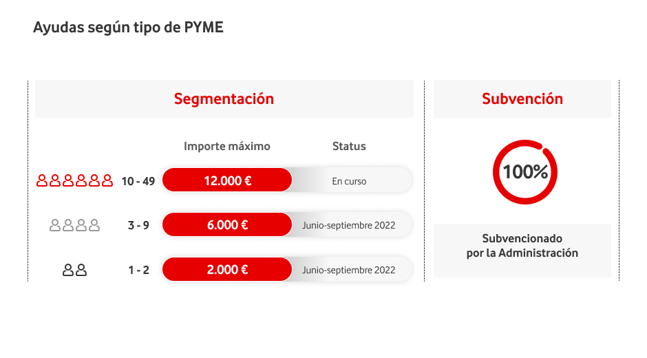 Hasta el momento solo pueden beneficiarse empresas de entre 10 y 49 empleados. Se estima que en verano las ayudas se abrirán a empresas de entre 3 y 9 trabajadores, con ayudas de hasta 6.000€ por negocio. Las microempresas y autónomos que tengan entre 1 y 2 trabajadores también podrán contar con un bono digital de 2.000 euros.