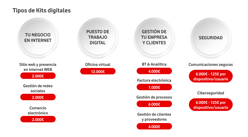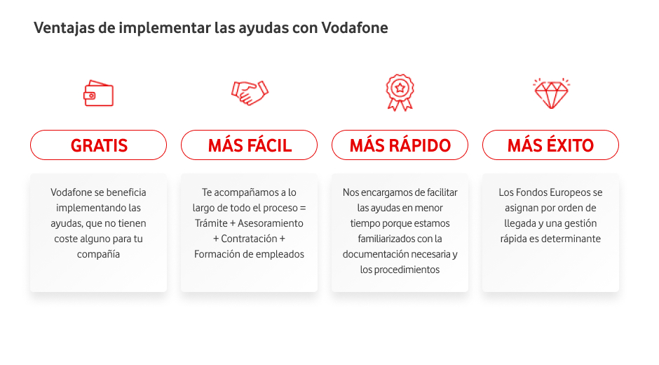 ¿Preocupado por la letra pequeña? En Vodafone únicamente ganamos dinero implementando las ayudas pagadas por la Unión Europea. Tú solo abonarás la parte correspondiente al IVA de los kits contratados el primer año. Lo que viene a ser una situación win-win.