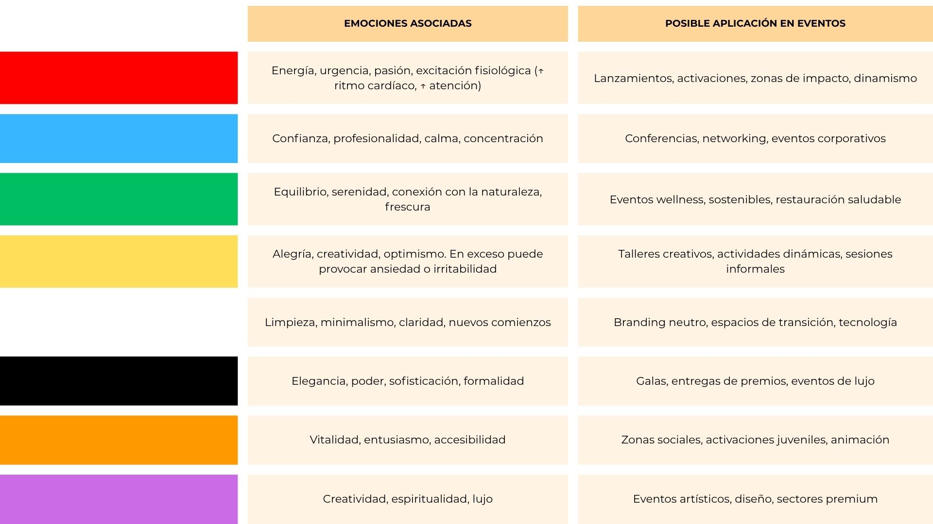 Agrupa cromáticamente los espacios de tu evento según el momento del journey: cálido para recibir-impactar, neutro para transición, frío para relajación/post-evento.