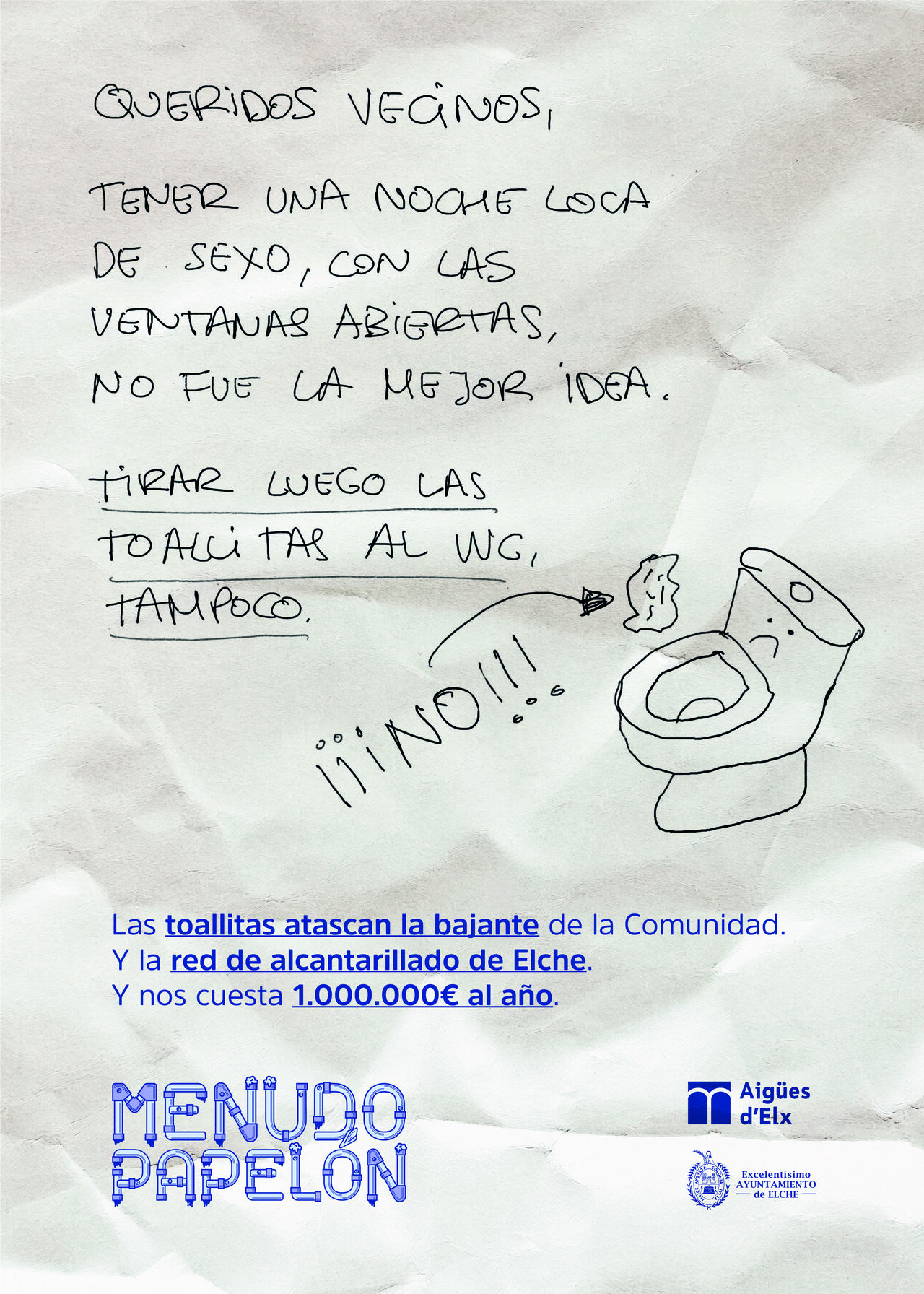 Algunas campañas de comunicación basan su estética o estrategia en apelar a esta “cutrez” para hacer calar mucho más su mensaje. Este ejemplo nos llega desde Aigües i Sanejament d’Elx. Menudo Papelón es una campaña para concienciar sobre las consecuencias de desechar toallitas húmedas por el inodoro, pero para ello utilizan uno de los medios de comunicación más “de andar por casa” que existe: la nota escrita a mano con la que los vecinos se han comunicado históricamente dentro de una misma comunidad.