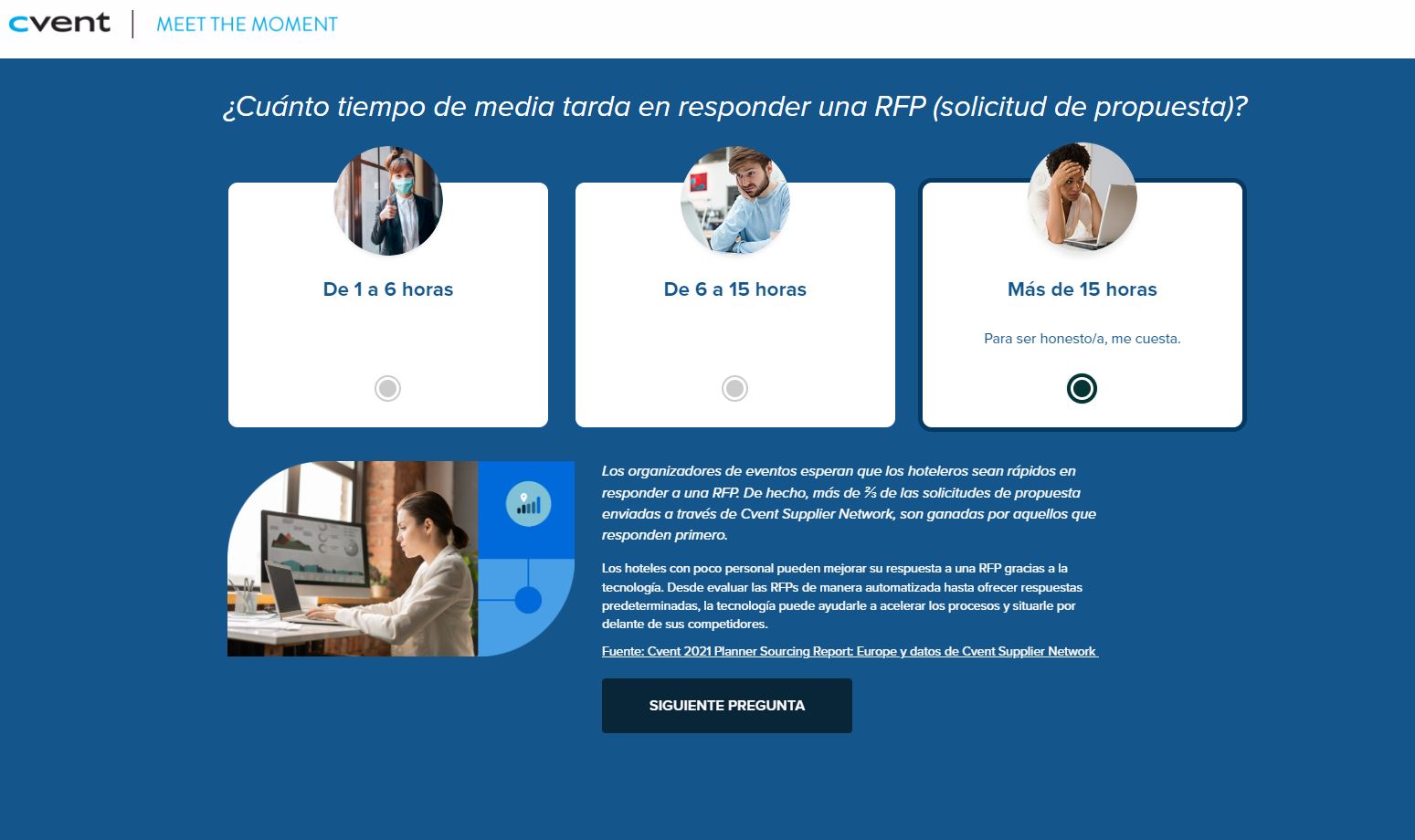 Con la ayuda del equipo de ventas de Cvent y los clientes de Cvent, desarrollamos un cuestionario sencillo pero informativo. Consta de 6 preguntas diseñadas para determinar, entre otras cosas, el tiempo que tardan los hoteles/sedes de eventos en responder a las solicitudes de propuestas, cómo gestionan los bloques de espacio o cómo trabajan con los compradores para diseñar los planes de asientos. Para Cvent era importante que las opciones de respuesta fueran lo más auténticas posible, así que utilizamos respuestas reales que hemos recibido de clientes y prospectos en el pasado.