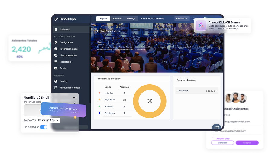 Con un software todo en uno como Meetmaps facilita que todas estas soluciones vivan en un mismo ecosistema integrado. Al unificar la gestión del antes, durante y después del evento, conviertes la tecnología en una verdadera palanca de valor estratégico para tu organización.
