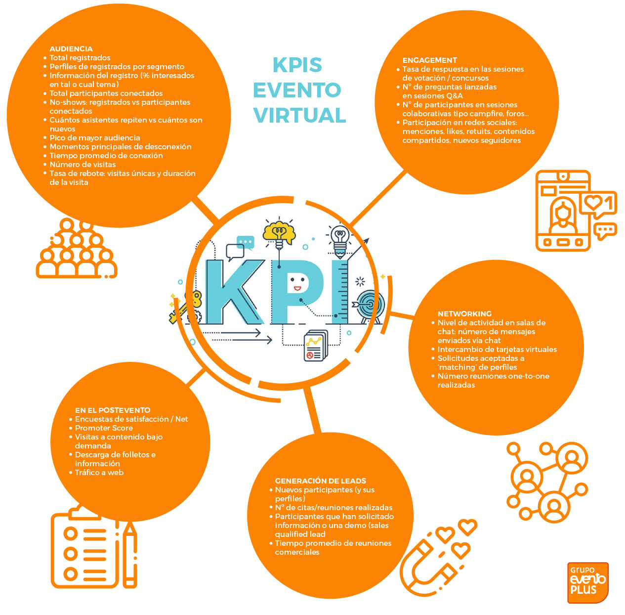 Si eres fiel a nuestros contenidos y te leíste nuestro informe sobre el impacto de los eventos (si no, te lo perdonamos y puedes redimirte descargándotelo aquí), sabrás que uno de los impactos que consigue un evento efectivo es su orientación a resultados. Ya sean leads de ventas, cambios en el comportamiento del target, formación a nuestros empleados, conocer nuevos clientes potenciales, todo se puede medir y más aún en el entorno digital. Por eso hemos querido recopilar los kpis que pueden ayudarnos a seguir el rendimiento de nuestro evento virtual en esta infografía.