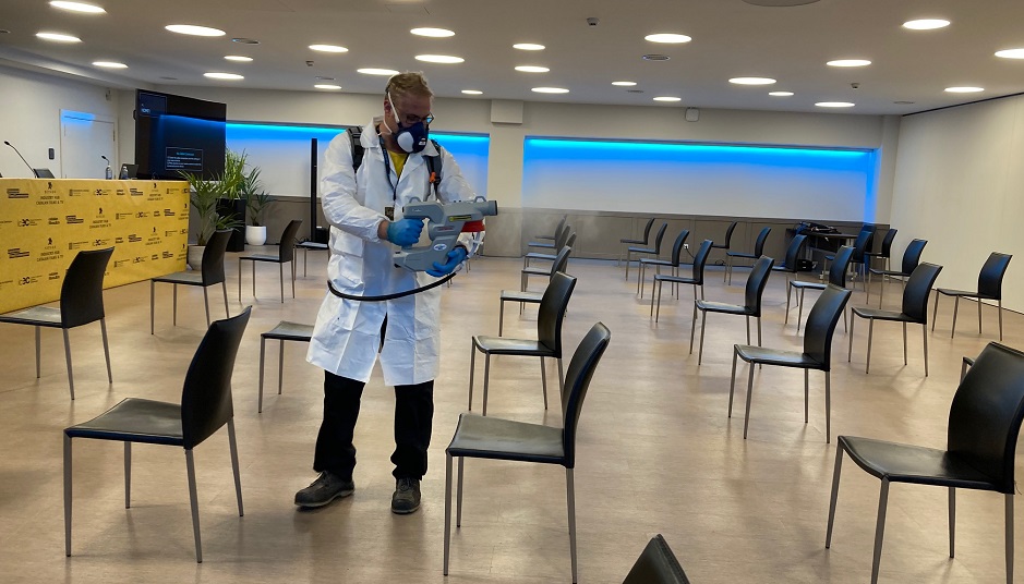 En ACTIVE Desinfección, firmes defensores de presencialidad, sabemos cómo generar entornos seguros con la mejor tecnología. Especializados en festivales, ruedas de prensa, encuentros empresariales y formaciones, llevamos a cabo la desinfección de alto nivel de superficies mediante pulverización electrostática. Rompemos cualquier posible cadena de contagios y sin plazo de seguridad, es decir, pudiéndose reutilizar los espacios en menos de 15min, lo que favorece el transcurso normal de un evento sin tiempos de espera añadidos. La pulverización electrostática genera microgotas cargadas eléctricamente que se expanden en forma de nube depositándose homogéneamente en las superficies, sin mojar y alcanzando rincones de difícil acceso.