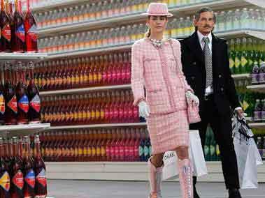 Lagerfeld organizó el desfile como un gran juego temático en el que las modelos fingían ser consumidoras, comparaban productos de las estanterías y llevaban carritos y bolsas de compra.