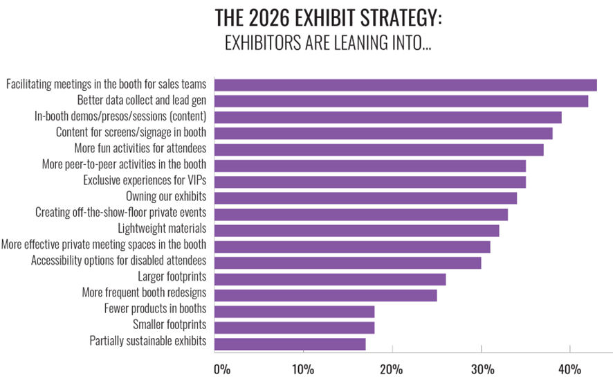 Entre las tendencias que despuntan destacan las reuniones one-to-one para apoyar a los equipos comerciales, una recopilación de datos más inteligente, demostraciones y presentaciones más atractivas, así como contenidos y señalética más eficaces. Todos estos nuevos objetivos se pueden englobar en una misma prioridad: la experiencia del asistente, por encima de cuestiones más tácticas como la apariencia del stand o el producto expuesto. Cabe señalar que, dentro de las tendencias para 2026 —en un escenario en el que la sostenibilidad empieza a adquirir cierta relevancia política—, ser o simplemente parecer más verde ocupa el último lugar. Nos recuerdan que una feria es mucho más que ocupar 100 m²: es el evento comercial por excelencia, un gran momento relacional difícilmente sustituible.