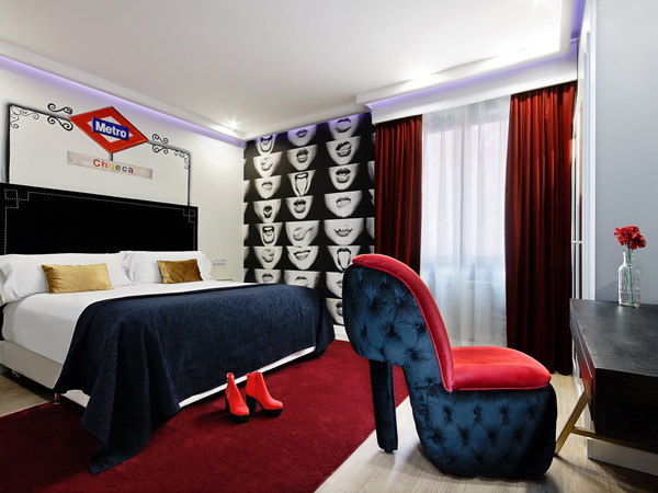 La decoración de la habitación está diseñada para recrear el espíritu que define a esta zona de la capital y sus lugares más emblemáticos, como la estación de Metro en la plaza que da nombre al barrio, imágenes que evocan la diversidad propia del mismo e, incluso, un sillón que emula la figura de un zapato de tacón.