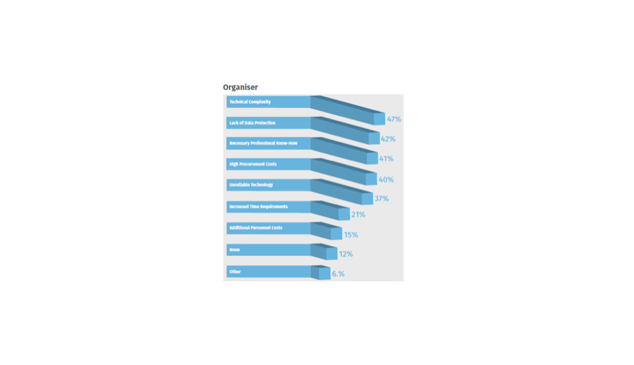Especialmente cuando se trata de la venta de entradas, las respuestas divergen fuertemente. Sólo la mitad de los organizadores están utilizando la emisión de billetes online, mientras que se ha convertido en indispensable para casi el 90% de los asistentes. Aunque los organizadores sienten que el marketing de eventos y la comunicación con los asistentes han sido optimizados con éxito, los asistentes creen que todavía hay margen para mejorar cuando se trata de información sobre las soluciones digitales utilizadas.