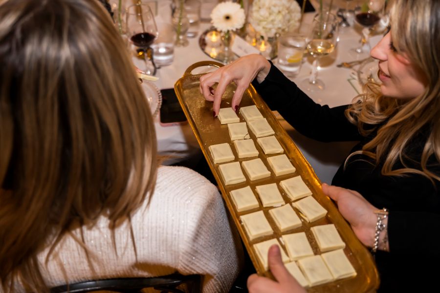 La propuesta gastronómica de Lindt siguió la misma lógica cromática. Platos en blanco, negro y verde, este último como guiño directo al pistacho, construyendo una experiencia que no solo se degustaba, también se observaba. Tras la cena, una dinámica invitaba a los asistentes a descubrir si su perfil encajaba más con el universo white o dark, trasladando el storytelling del producto al terreno personal.