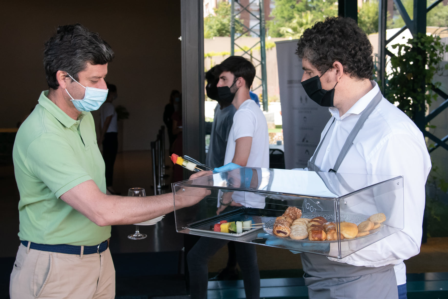 7.Crear instrucciones de seguridad claras para los asistentes. Previamente al evento se envió a todos los asistentes confirmados un documento de normas de seguridad y planos de todas las zonas del evento para garantizar que la movilidad fuese lo más fluida posible. Se pedía su consulta y su lectura pormenorizada y se indicaba que acceder al evento suponía la aceptación de esas normas y que incumplirlas podría conllevar a la exclusión del mismo. Esto no fue necesario pues el comportamiento de todos fue totalmente responsable: distanciamiento en la cola, control de temperatura, pasar por la estación de higienización compuesta de alfombrilla desinfectante y dispensador de gel hidroalcohólico, acceso con QR sin ninguna documentación, entrega de mascarilla y ¡a disfrutar! En el auditorio, un asiento libre a cada lado, señalizado para que no se use, todos sí o sí con la mascarilla, y finalmente una salida escalonada en tres grupos hacia el jardín donde se realizó el desayuno.