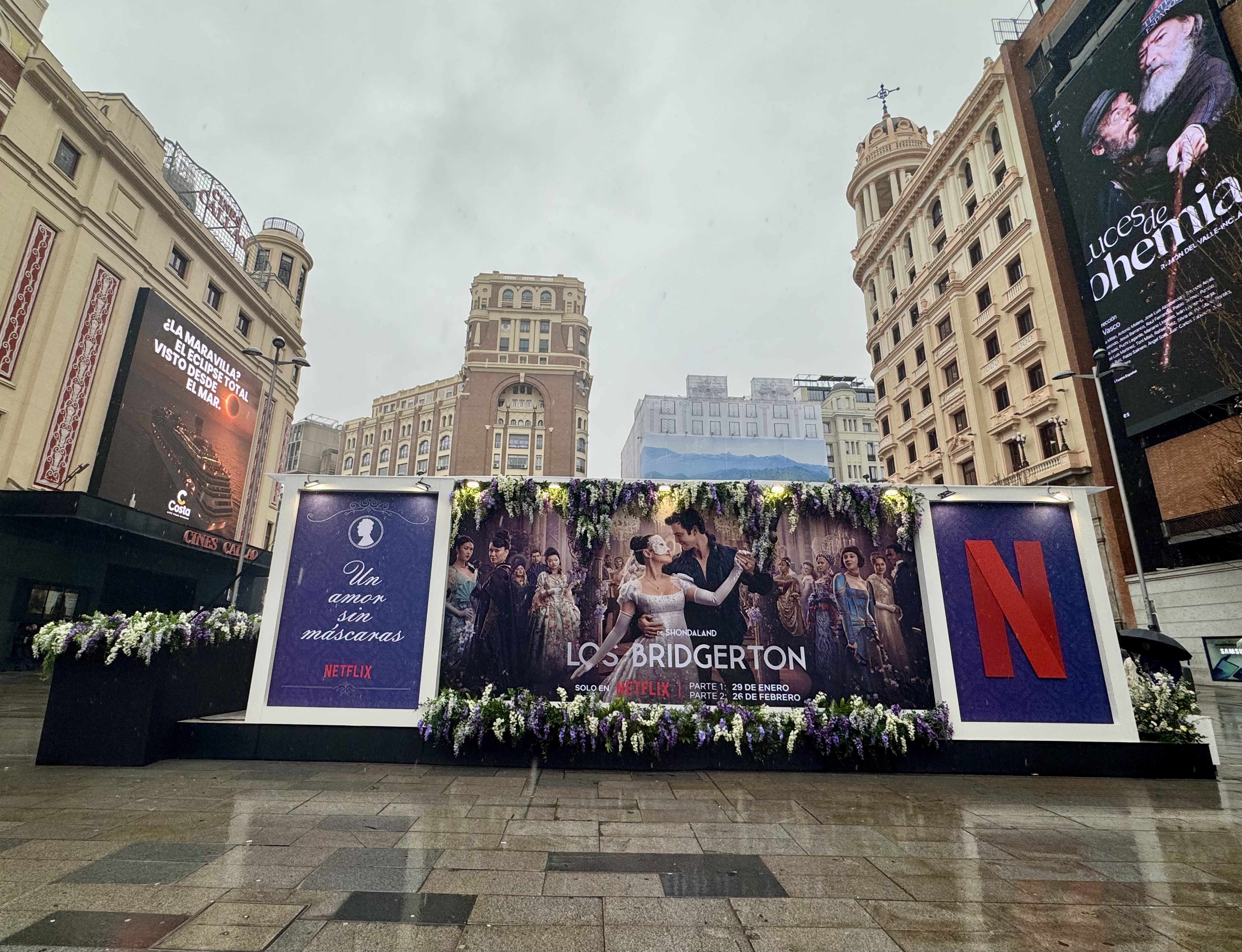 Con motivo del estreno de la segunda parte de la cuarta temporada de la serie, Netflix ha desplegado en Madrid una estrategia experiencial que va mucho más allá de la promoción tradicional. La plataforma ha transformado la ciudad en escenarios del universo Bridgerton, combinando activaciones abiertas al público con eventos diseñados para reforzar el sentimiento de comunidad y conversación social.