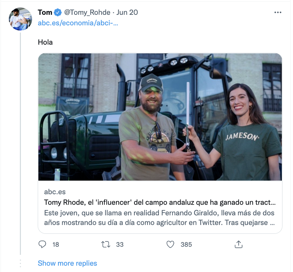 Como hacer la entrega del tractor y conseguir una simple foto para colgar en la oficina les pareció poco, decidieron crear un evento en el pueblo de Tom, La Carlota (Córdoba). Con el tiempo a contra reloj, crearon una campaña con el hashtag #ElTractordeJamesonParaTom a través de la que se realizó el seguimiento de todo el proceso de organización hasta llegar a la fiesta de Jameson en la plaza mayor del pueblo. El evento fue un mix de la personalidad de Jameson y la de La Carlota, con sus peluquerías, tiendas de ropa y puestos de comida, pero también con la barra, un escenario, y una wedding chapel, sobre la que realizaron un show de mapping. La entrega de las llaves del tractor a Tom se hizo ante más de 1.500 personas y Twitter como testigos. La acción generó una conversación activa de más de dos semanas en el hashtag, con 56 millones de impresiones orgánicas, 101.298 interacciones orgánicas, 28.444 post generados, y 3.700 nuevos seguidores… y todo con una inversión de 0 euros en la amplificación de medios. Fueron dos veces consecutivas TT, la primera el 3 de mayo, y otra vez el 19 de mayo superando a Ibai Llanos. Generaron el Media Value del año, 197.846€, y lograron impactar a más de 84.500 personas de forma orgánica.