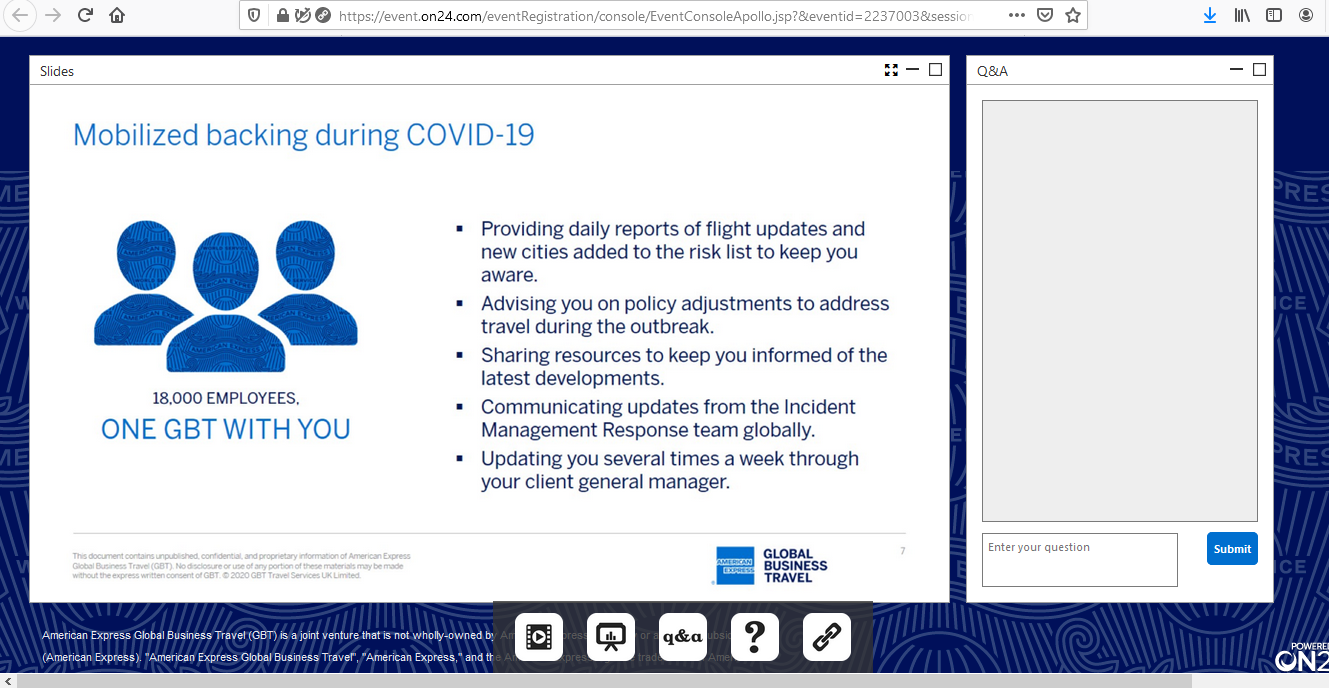 Un cliente puede tener dudas de cómo gestionar sus viajes en este entorno de gran preocupación así que el gigante de las agencias MICE propuso un webinar donde sus varios expertos relevantes en este contexto explicaron cómo los servicios de la agencia se adaptaban y lo que podían hacer sus clientes. Un formato un poco estático en nuestra opinión (powerpoints comentados con poco ritmo) en una sesión obviamente centrada en el contenido más que en la forma de distribuirlo. Un formato también un poco auto-promocional pero la agencia quería mostrar a sus clientes que están a su lado en estos momentos, y su comunidad de clientes es tal que una difusión de contenidos venidos de sus expertos globales en temas de gestión de riesgos de este tipo, era probablemente necesaria.