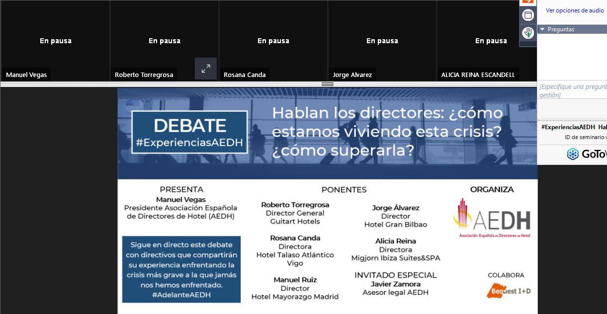 Bajo el hashtag «#ExperienciasAEDH, la Asociación de Directores de Hoteles apuesta por organizar webinars debate cada semana profundizando en una temática. En el primero de ellos varios directores y profesionales comentaron sus experiencias durante el mes de marzo: cómo han tenido que actuar, anécdotas, cambios en procedimientos; relación con personal, clientes, proveedores y competencia; expectativas y previsión de acciones a medio y largo plazo… Manuel Vegas, el presidente de la AEDH se encargaba de moderar y guiar los turnos de palabra de directores de todo el país, el Talaso Atlántico en Vigo, Guitart Hotels en Girona, el Hotel Mayorazgo en Madrid, Gran Bilbao y Migjorn Ibiza Suites&SPA.