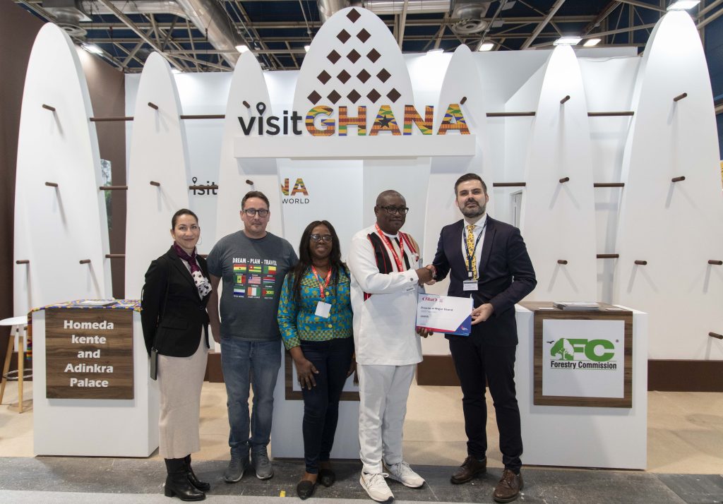 El stand de Ghana recreó la fachada principal de la mezquita de Larabanga, ofreciendo información a los asistentes sin necesidad de mucho contenido gráfico. Invitó a los visitantes a descubrir los puntos de interés del país a través de la fotografía.