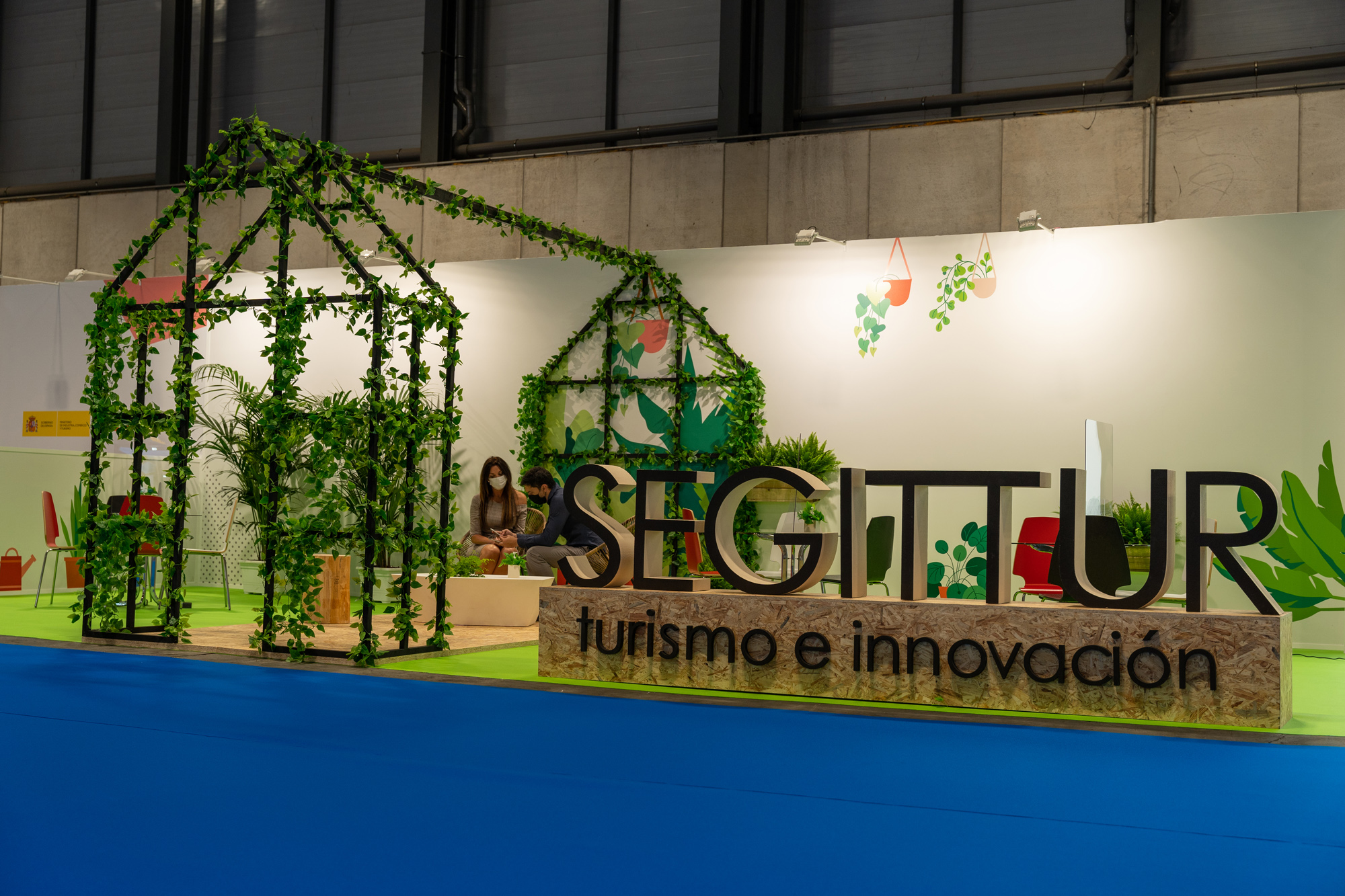 El stand, diseñado y producido por el departamento Events & Liveness de Newlink, está inspirado en la geometría del logotipo de Segittur y de él destaca la zona de networking inspirada en las terrazas de Madrid con una amplia zona verde cargada de naturaleza y qye desprendía un aroma característico.