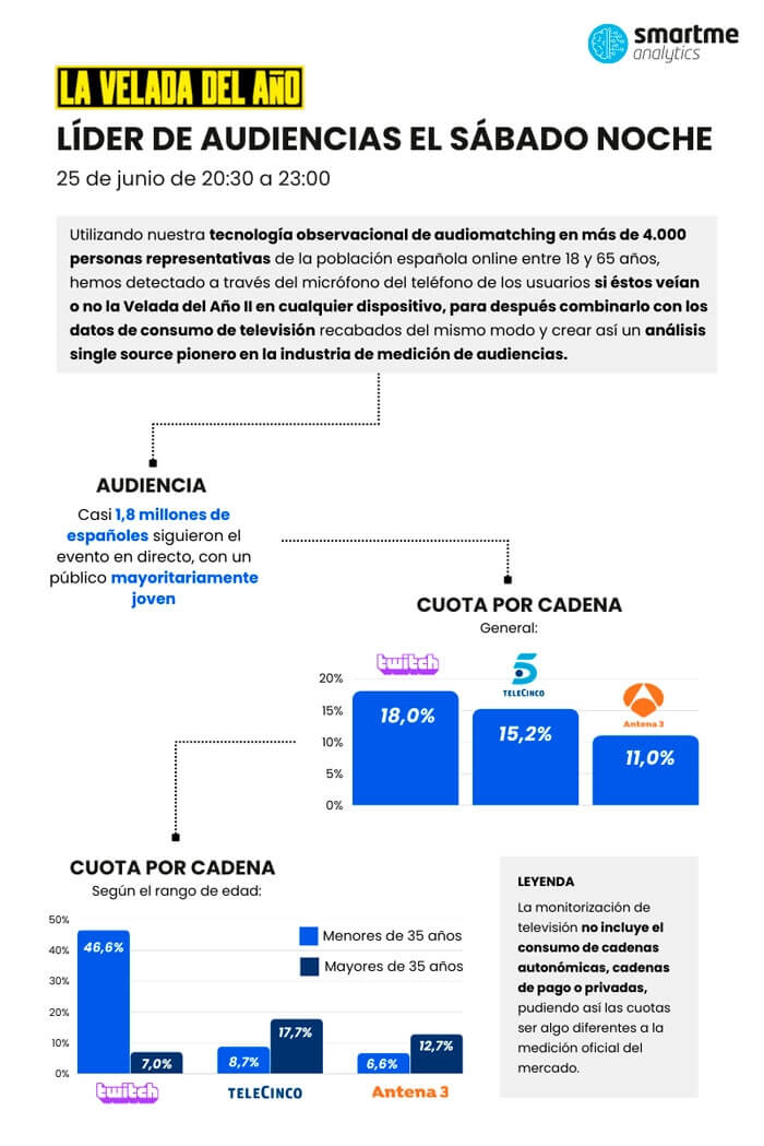 Para monitorizar el consumo del evento, la empresa recurrió a un análisis single source pionero en la industria de medición de audiencias (diferente a la que emplean otros como el EGM). Este utiliza los micrófonos de los teléfonos de los usuarios -que han dado su permiso-, para detectar lo que está consumiendo cada uno, en este caso la Velada. Los datos extraídos después se combinan con los datos de consumo de televisión recabados del mismo modo. Esta metodología permite conocer, en base a la misma porción de población, cómo consumen los distintos medios y contenidos audiovisuales. Así pues, los resultados le dan al canal de Ibai un 18% de cuota de pantalla en ese tramo de la noche, superando otros contenidos televisivos de esa misma noche (15,2% de Telecinco y el 11% de Antena 3).