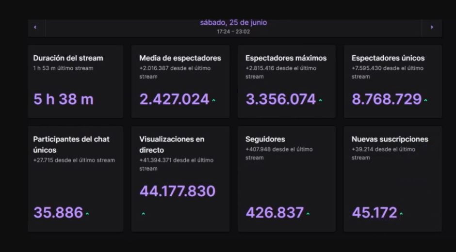 Como ya había anunciado al final de la velada, el evento consiguió un pico máximo de 3.356.074 espectadores (en realidad se suman dispositivos, así que el número de viewers seguramente fue superior), un promedio de 2.427.024 y un total de 8.768.729 usuarios únicos. Durante las casi seis horas que duró el directo, Ibai consiguió acumular 426 mil nuevos seguidores en su canal y sumó 45 mil nuevos suscriptores (convirtiéndolo en el streamer de Twitch con mayor cantidad de abonados, casi 120 mil).