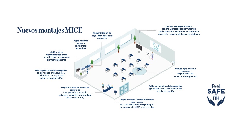 Contenido escrito y patrocinado por: NH Hotel Group Con el fin de garantizar la seguridad y la salud de sus clientes y empleados, NH Hotel Group ha rediseñado la propuesta de experiencia en el área de reuniones y eventos de sus hoteles. La Compañía ha revisado cerca de 700 estándares e impulsado la digitalización de sus servicios, para facilitar el distanciamiento social y asegurar que se extrema la higienización y seguridad en los espacios destinados al segmento MICE (Reuniones, incentivos, congresos y exhibiciones). En los últimos meses, la Compañía puso en marcha una encuesta con sus clientes corporativos para conocer de primera mano las necesidades del segmento MICE a incorporar durante el proceso de reactivación de la actividad. NH Hotel Group ha desarrollado su plan de medidas para el área de eventos y reuniones teniendo en cuenta las respuestas de más de 1.000 especialistas de este segmento, las indicaciones de expertos en inspección, análisis y certificación, así como las recomendaciones de la Organización Mundial de la Salud, y de las autoridades locales.