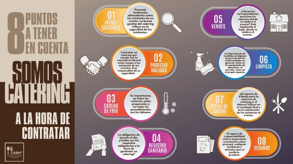 5. Venues. ¿Has pensado si tienen los correspondientes permisos los espacios donde se celebra el evento? La AEC recuerda que debe estar legalizado el lugar donde se celebra el evento y eso supone también contar con espacios acondicionados para el catering (punto 7).