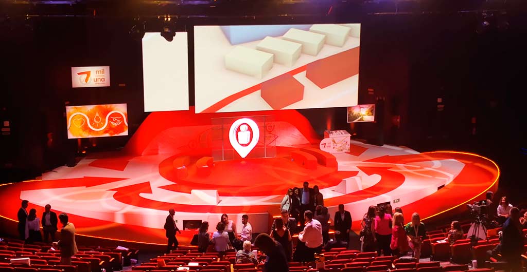 Las transparencias también pueden funcionar en el caso de contar con un escenario. AV Medios con su pantalla led transparente crea efectos de holografía a gran escala. Así, en el evento todo gira en torno a un punto centrado y se va jugando con el contenido interactivo en 3D como el logo del cliente.  También asegura, según AV Medios, “un momento Wow!” al emplearla como si de una cortina se tratase, no permitiendo ver tras ella al maestro de ceremonias que se esconde y que se desvelaría cuando interese.