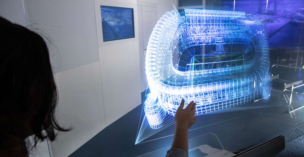 Si buscas una opción también inmersiva, pero más ligera a la vista que una pared, otra opción puede ser una pantalla holográfica táctil. Desde Pictures That Move nos cuentan que solo la sala inmersiva de Inditex de Arteixo ha acogido esta pantalla interactiva. Cuenta con un proyector de imagen sobre un cristal transparente que se puede controlar vía táctil. Este tipo de pantalla es especialmente interesante en el caso de reproducción de contenidos creados Ad-Hoc aprovechando así al máximo la transparencia  el efecto holográfico.