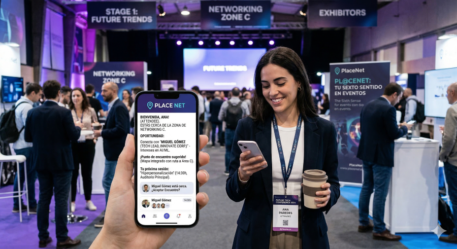 PlaceNet no propone crear una nueva aplicación. Tampoco sustituir la que ya existe. Su tecnología se integra en la app del evento y la transforma en tiempo real. Eso significa que dos asistentes pueden abrir la misma app, en el mismo lugar y al mismo tiempo, y ver cosas completamente diferentes. Contenido, servicios, mensajes, funcionalidades. Todo cambia en función de quién eres, dónde estás y qué está pasando. Un ejemplo sencillo. Antes de entrar al evento, la app puede priorizar tu entrada. Durante, puede ayudarte a encontrar contactos relevantes. Al salir, puede activar encuestas o recoger feedback.