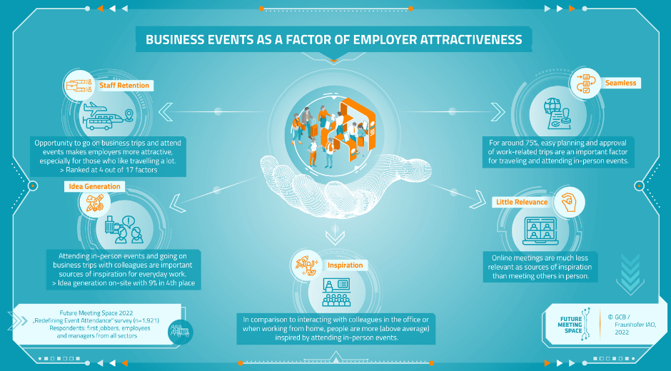 Retención de personal: Los resultados muestran que las personas que afirman disfrutar viajando clasifican los viajes de negocios como factor de atractivo y fidelidad a su empresa en cuarto lugar de un total de 17 factores encuestados. Los datos de la encuesta también revelan hasta qué punto los viajes de negocios y relacionados con eventos se consideran una fuente y un lugar de inspiración para nuevas ideas e innovación.
