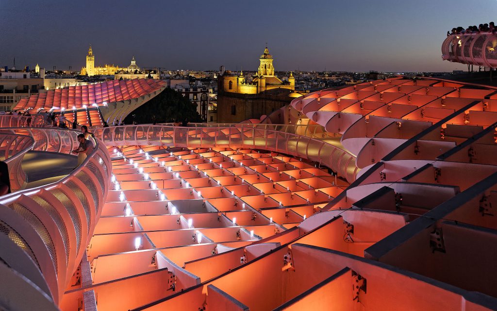 Las Setas de Sevilla, oficialmente conocidas como Metropol Parasol, se alzan en la Plaza de la Encarnación como uno de los hitos arquitectónicos más singulares y reconocibles de la ciudad. Este espacio, que combina su papel de monumento contemporáneo con una clara vocación funcional, ofrece también opciones para la celebración de eventos al aire libre. Entre ellas, destaca la Terraza Panorámica y sus pasarelas situadas en la planta mirador, a 21 metros de altura. Este espacio, con capacidad para hasta 150 personas en formato cóctel, ofrece una vista de 360 grados sobre la ciudad. Friendly reminder: ¡Ten muy en cuenta la puesta de sol!