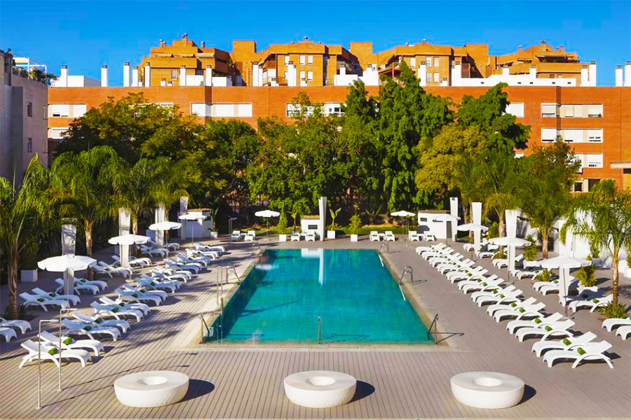 El Hotel M.A. Sevilla Congresos cuenta con una zona exterior que puede adaptarse para eventos. La terraza, situada junto a una piscina de agua salada y rodeada de zonas ajardinadas y solárium, tiene una capacidad que varía entre 50 y 100 personas, dependiendo del montaje.