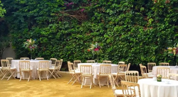Los jardines de Casa Bucarelli, enmarcados por una arquitectura del siglo XVII, también ofrecen un entorno singular para eventos al aire libre. La capacidad varía según el formato: hasta 100 personas en cóctel, entre 60 y 80 en banquete, y de 40 a 70 para recepciones más reducidas. Además, es posible combinar el uso de los jardines con los salones interiores, lo que permite una mayor flexibilidad en el diseño del evento.