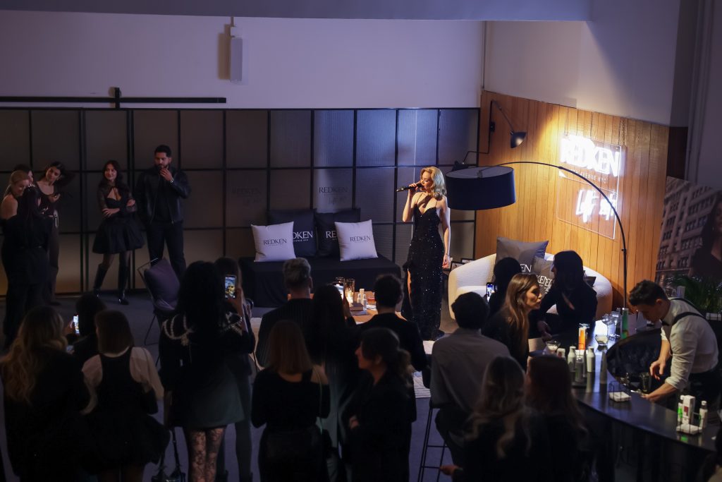 Cada zona del loft estaba pensada para ofrecer una experiencia distinta: un salón con música en directo donde sonaban grandes éxitos de Nueva York y de la propia Sabrina; una barra de cócteles donde las bebidas se personalizaban con el logo de Redken; un tocador/backstage para probar el sérum y recibir un peinado express.