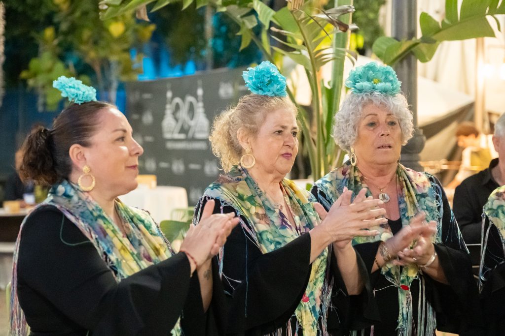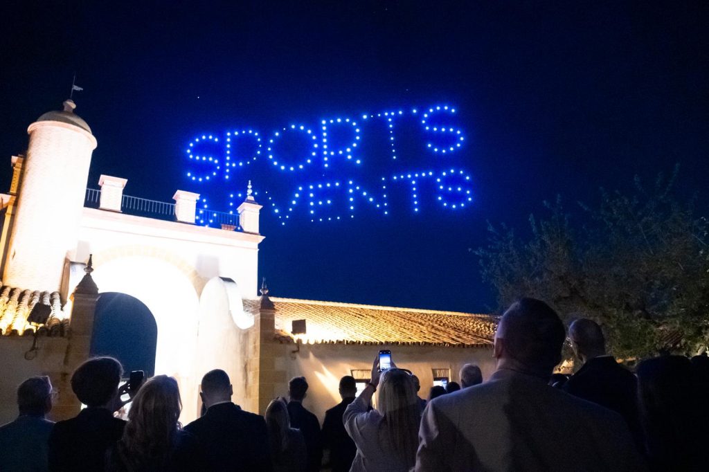 Al caer la tarde, llegó el momento de prepararse para la gran velada. A las 20:00h, los autobuses de Rosabus trasladaron a los invitados a la Hacienda la Soledad, donde un atardecer de tonos rosados nos recibió. Tras el arco del recinto, nos aguardaba una sorpresa en las alturas: Umiles desplegó sus drones para realizar un viaje visual por la historia de los Juegos Olímpicos, culminando con el nombre del evento, SPORTS & EVENTS, dibujado en el cielo. La cena fue servida por Catering Robles y el broche de oro musical lo puso el ritmo de The Beer Band Theory.