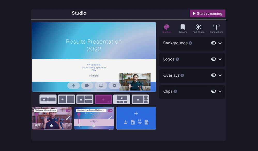 Para crear esta plataforma, la empresa ha desarrollado una innovadora tecnología de producción de vídeo en vivo profesional. Está basada en un motor de vídeo que permite combinar, fácilmente, equipamiento de bajo coste como las cámaras web, con elementos de nivel broadcast (por ejemplo, sets virtuales o gráficos dinámicos en 3D). Y todo ello, accediendo desde un simple navegador web, ya que el sistema está totalmente desplegado en la nube.