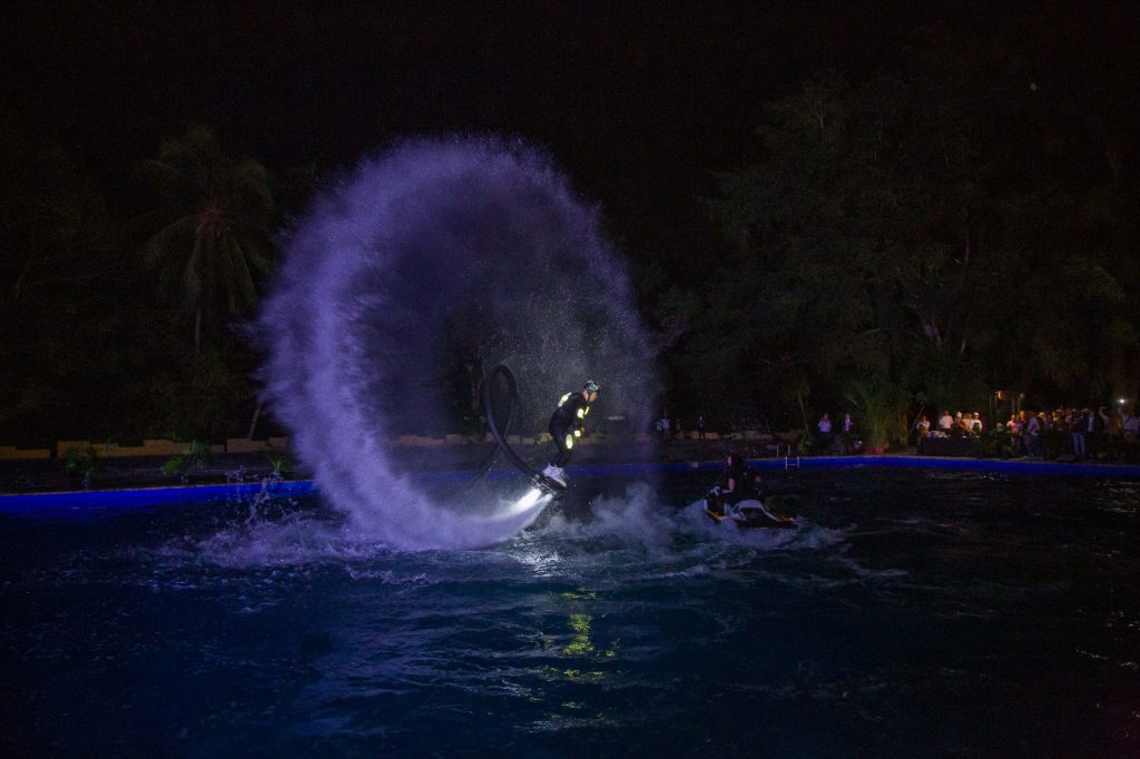 Otro espectáculo del equipo de Creartys fue un show de Flyboard dentro de una piscina en el que el artista, varias veces campeón del mundo en este deporte, como nos cuentan, realizó varias piruetas en el cielo.
