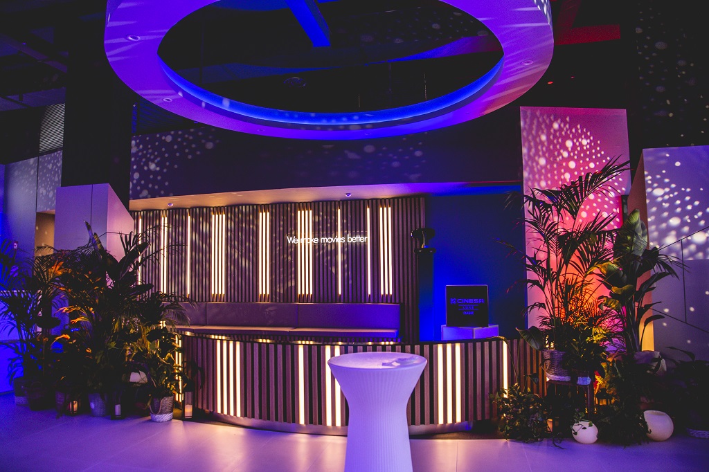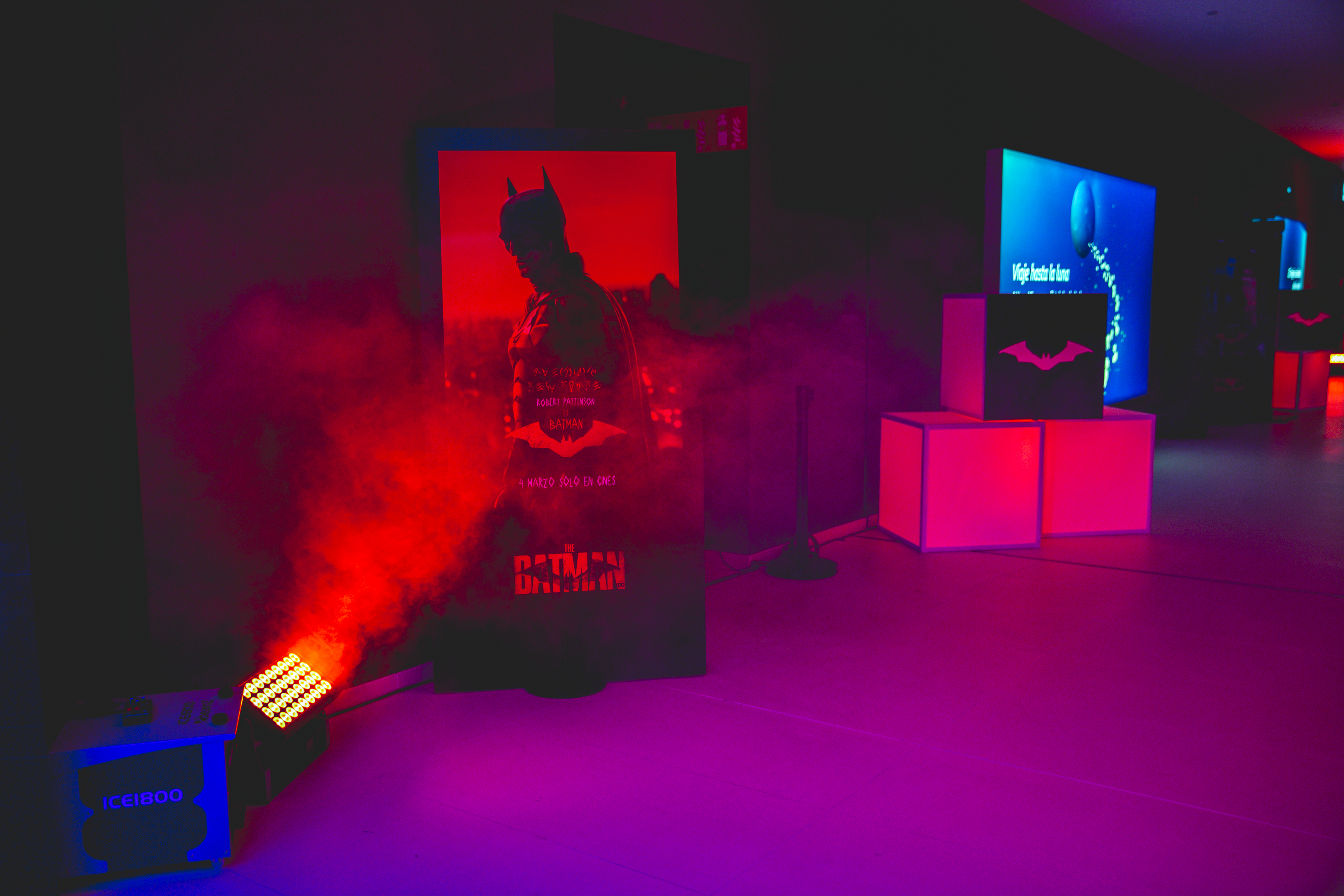 Proyección de diferentes gobos (Cinesa y Batman), y un neón con el claim de Cinesa: “We make movies better” fueron claves también en la decoración.