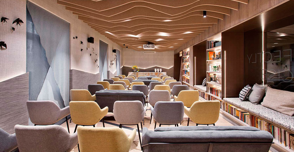 AC Lounge ‘Lounge by AC Hotels By Marriott’. ¿Una representación de una sala para eventos? Marriott diseñó este espacio para explicar las diversas opciones que ofrece la cadena a clientes y empresas para reunirse en los hoteles. En términos de sostenibilidad, todo el mobiliario se reutilizará en hoteles de la cadena. El techo de lamas está hecho con botellas de plástico recicladas.