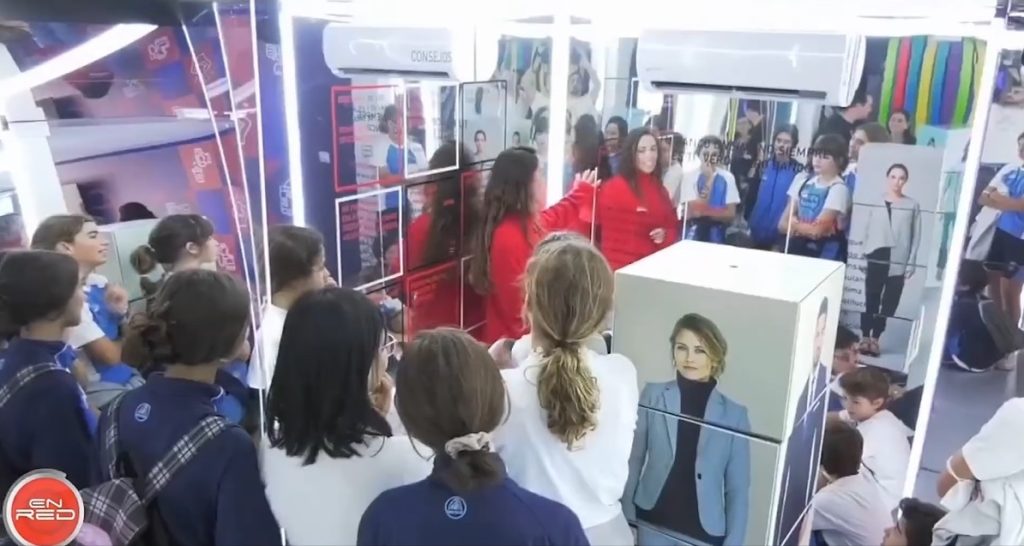 Este espacio con identidad propia está diseñado con un mensaje claro y directo que capta la atención de los más jóvenes. En definitiva, los visitantes consiguen sumergirse en este recorrido de 470m2, formado por siete contenedores marinos reutilizados, con un diseño colorista y atractivo en el que se retratan las dos caras de las redes sociales a través de contenidos interactivos para reforzar los mensajes clave.