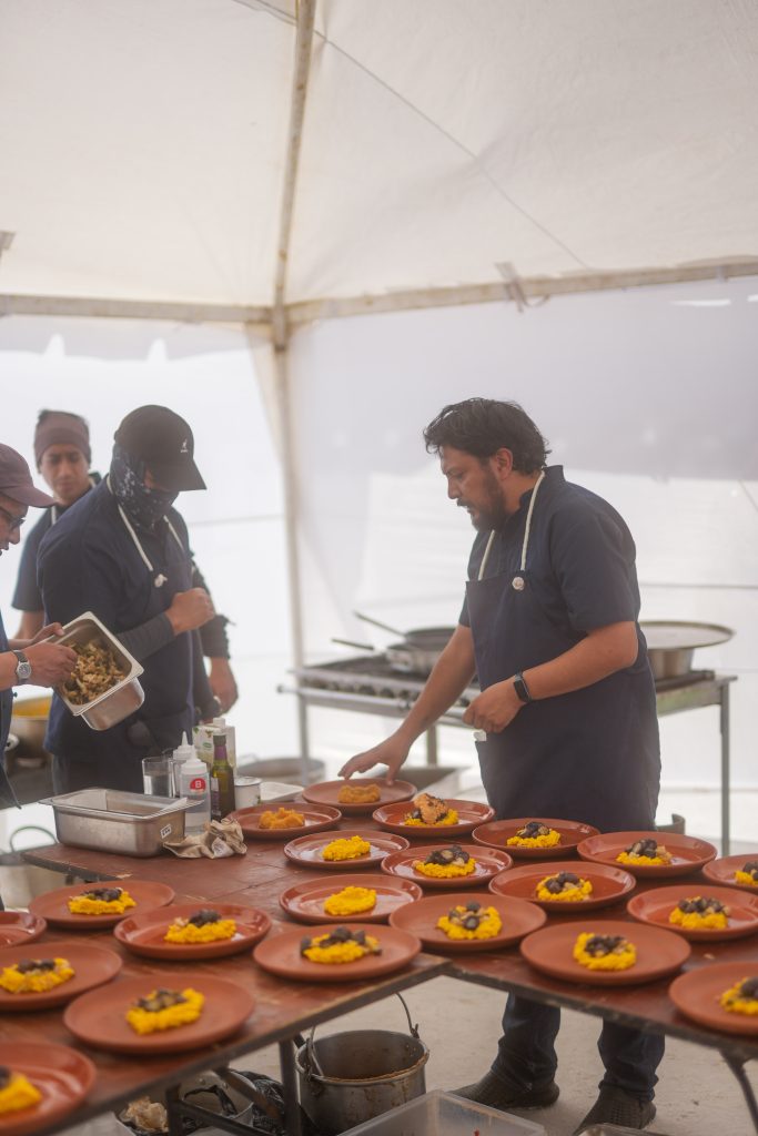 Como en el salar no hay ni agua ni luz montaron una cocina ad hoc tres días antes con una carpa cerrada con los hornos, planchas, freidoras, etc.