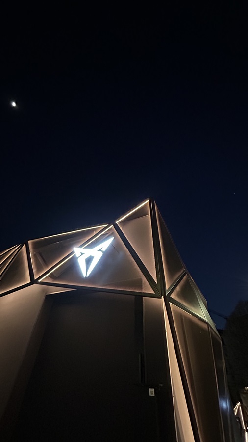 Dicom_events artículó la estructura alrededor de un edificio central con una piel envolvente en forma de ola compuesta por triángulos de chapa microperforada, lacada en el color muy reconocible del Cupra, el bronce century. Durante el día, la luz natural generaba reflejos dinámicos sobre su superficie. Por la noche, una cálida iluminación transformaba la piel del edificio, creando un juego de transparencias y volúmenes que le daban vida propia.