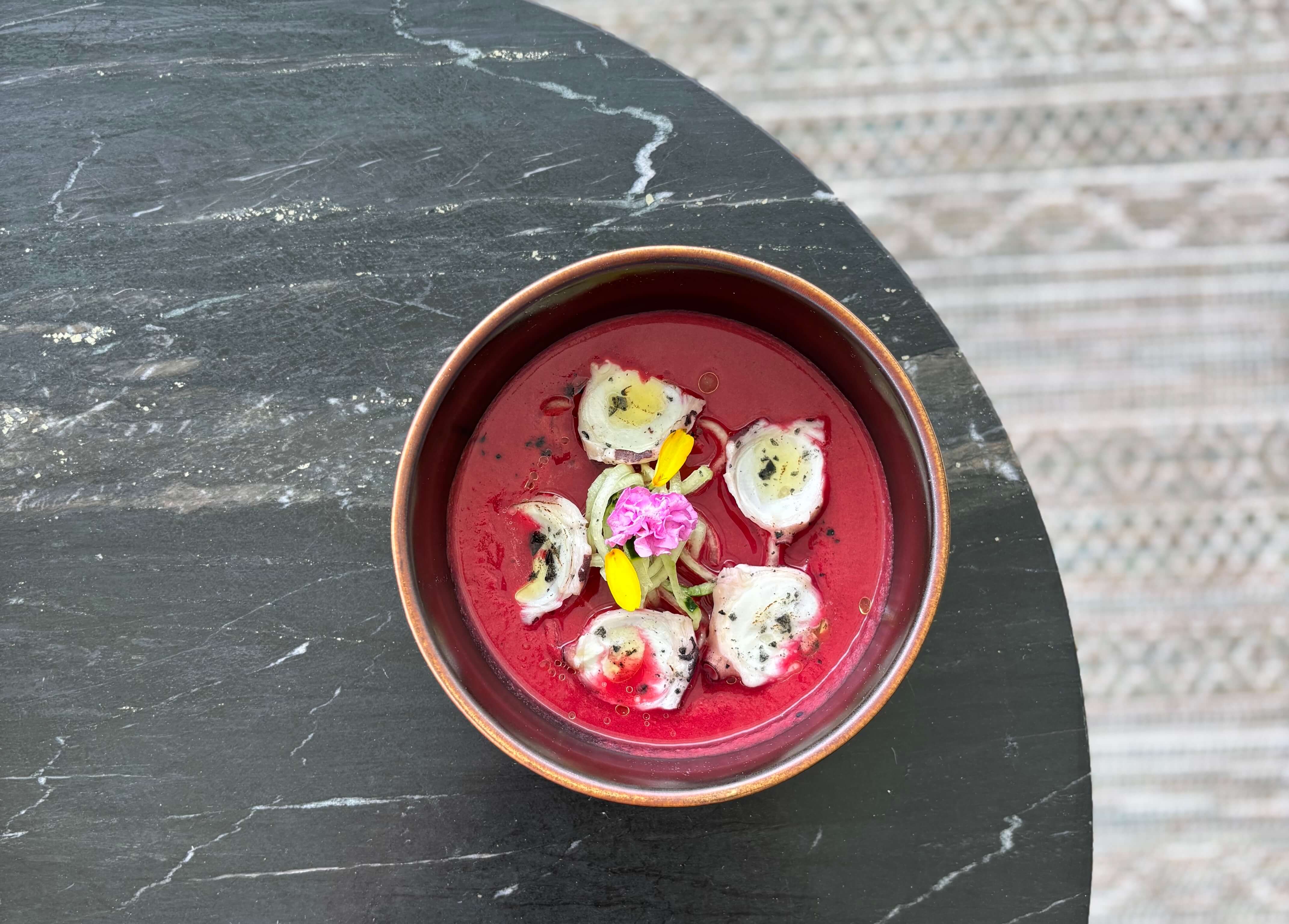 El menú inspirado en El fantasma de la Ópera arrancaba con un gazpacho de remolacha con pulpo y tallarines de pepino, un guiño visual al telón de terciopelo que se alzaba cada noche para dar paso a Christine, la protagonista del musical. Como plato principal, se sirvió un lomo bajo madurado con salsa café París, un homenaje al propio Fantasma —Erik—, criado y forjado en las entrañas de la ópera, profundo y lleno de matices.