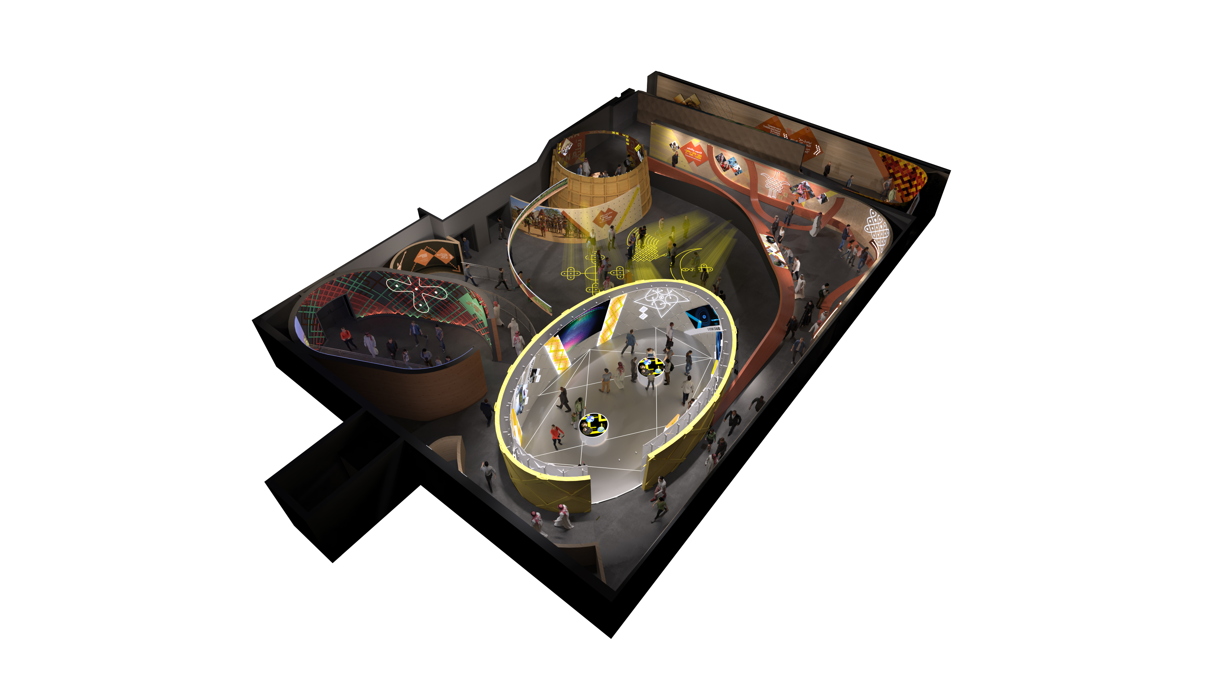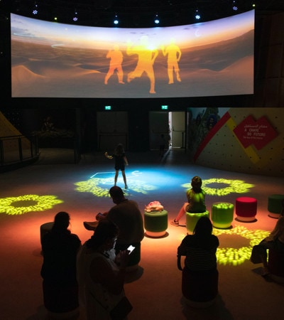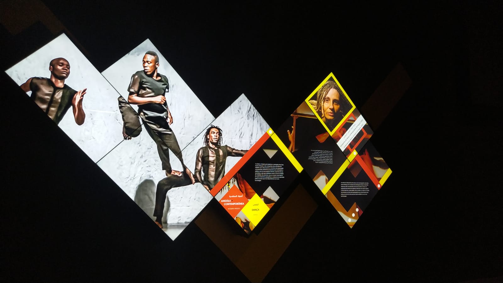 En el recorrido encontraremos también una proyección panorámica de diversos paisajes de Angola. En una pared curvada y con un suelo sinfín, utilizaron seis proyectores de los cuales tres nos proyectan la vista frontal y tres, en cenital, proyectando en el suelo y logrando de esta forma crear una imagen continua.