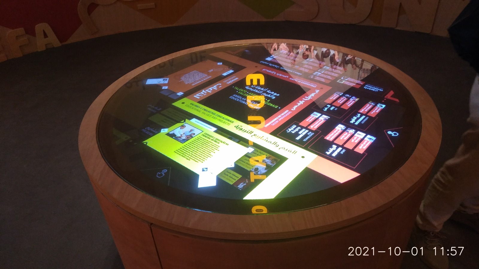 Otro atractivo de la instalación son las mesas redondas táctiles retro-proyectadas de un metro de diámetro. En este caso Eikonos ha reunido un proyector láser con óptica corta, un espejo de primera reflexión y una membrana táctil redonda para que el público interactúe con los contenidos.
