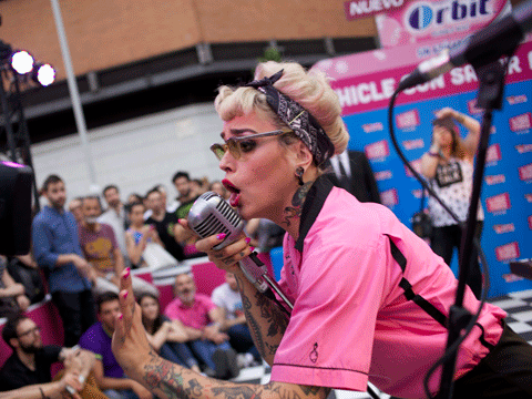 No faltaron las camareras patinadoras que repartían a los asistentes un menú en consonancia con la ambientación: mini-hamburguesas, cupcakes, donuts y batidos. Para acceder al diner solo había que presentar un paquete de chicles Orbit Bubblemint. El toque vintage y más animado lo dio el concierto de la artista rockabilly Vinila Von Bismark.